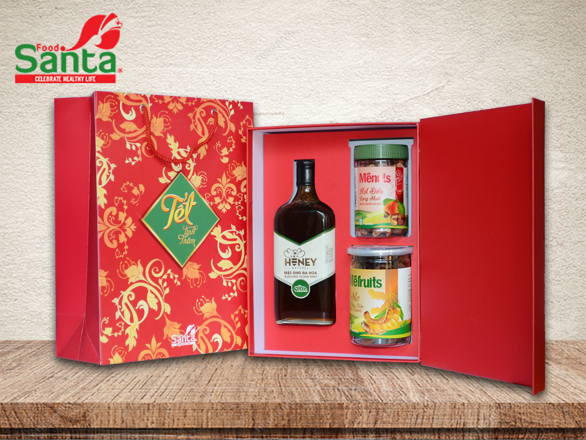 Bộ sản phẩm bao gồm: 01 chai Mật ong đa hoa 600ml. 01 hộp Me sấy dẻo Mefruits 250g. 01 hộp Hạt điều Santafarm 200g.